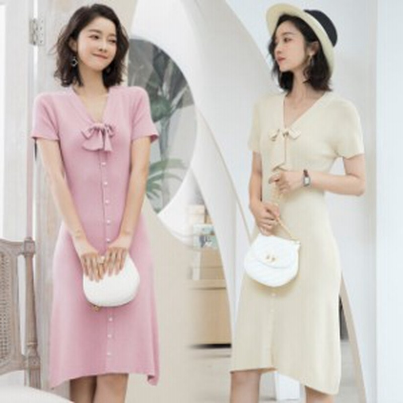 ワンピース ニットワンピース Vネックワンピース ニット 半袖 前ボタン リボン 着痩せ 春 夏 結婚式 入園式 ママ 着痩せ 30代40代50代 通販 Lineポイント最大1 0 Get Lineショッピング